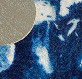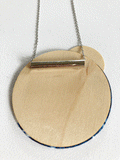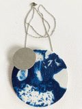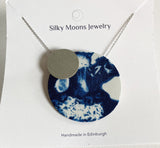 The necklace is on a long silver chain and has a large beatiful disc, handmade with upcycled silk fabric, in a pattern of blue floral shapes on a soft white background. The silver disc is lasar cut 0.8mm plywood, handpainted and beautifully finished. The necklace is very lightweight, meticulously hand stitched and precisely finished. The style is contemporary, smart, deceptively simple and great for a funky new look. The image of the necklace being worn is by Mike Morrison.